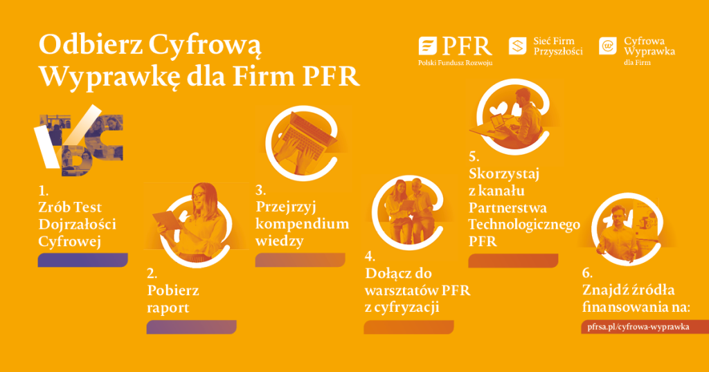 Planujesz usprawnienie i automatyzację procesów w firmie, lecz nie wiesz jak się do tego zabrać? Z pomocą przychodzi Cyfrowa Wyprawka dla Firm od PFR, która w 6 prostych krokach przybliży Twoją firmę w kierunku cyfryzacji.