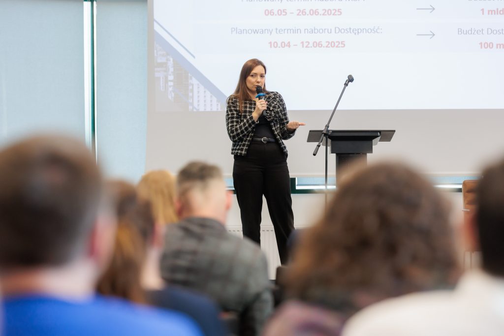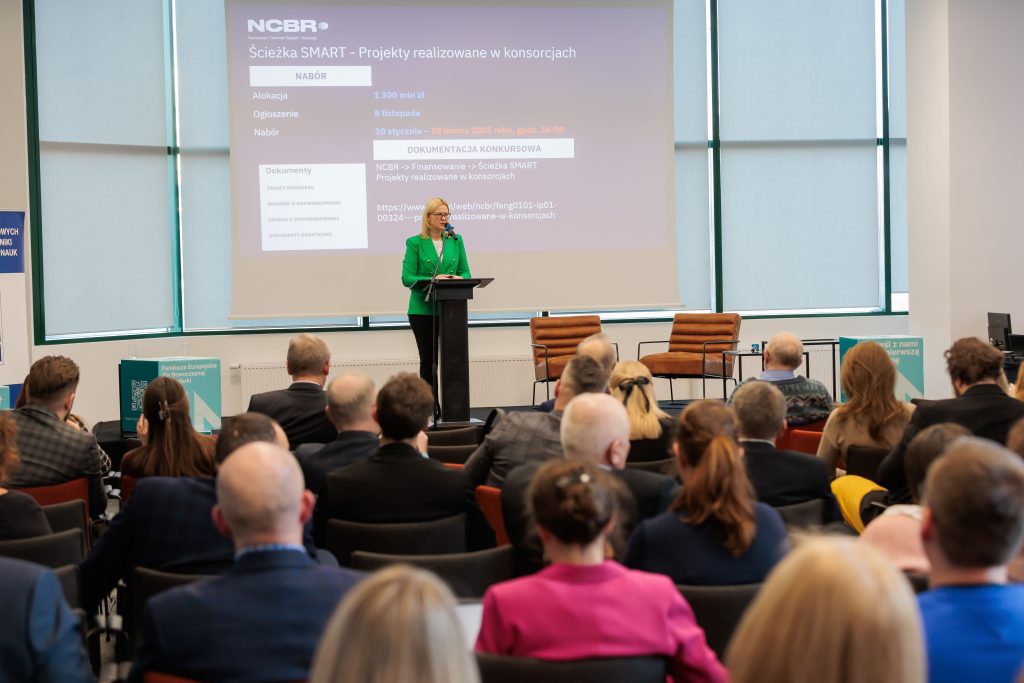 Kolejne wystąpienie należało do Marii Szufleńskiej, koordynator projektu w Dziale Dotacji Krajowych i Funduszy UE Narodowego Centrum Badań i Rozwoju. Opowiedziała o tym, jakie warunki trzeba spełnić i kto może pozyskiwać fundusze w ramach konsorcjów projektowych i dużych firm. Można było dowiedzieć się także więcej o ścieżce SMART oraz o programach FENG i Horyzont Europa.