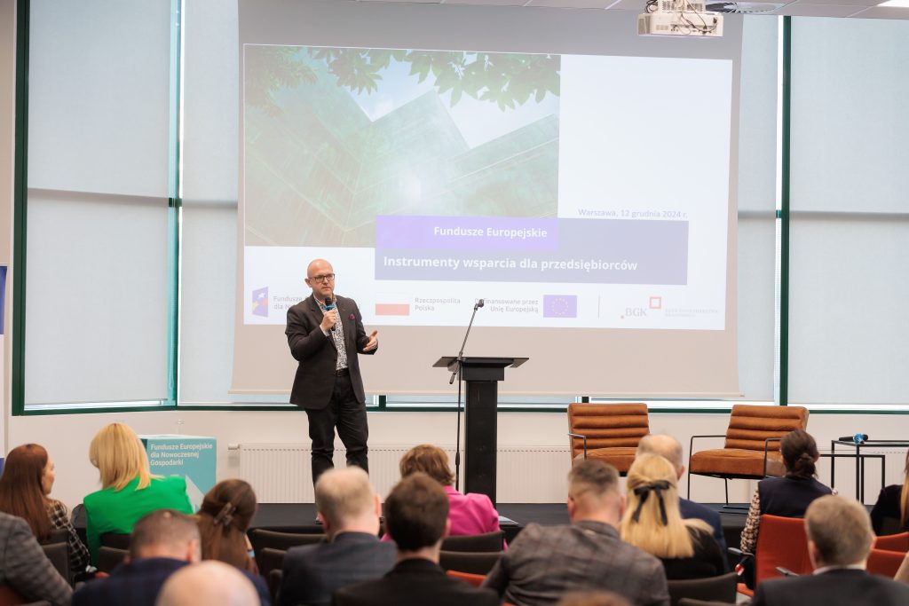 Piotr Natkański, dyrektor Biura Rozwoju i Relacji Biznesowych w Departamencie Gwarancji i Poręczeń Banku Gospodarstwa Krajowego, opowiedział o ofercie wsparcia finansowego BGK dla przedsiębiorstw, m.in. o możliwości uzyskania kredytu ekologicznego i o jego podstawowych założeniach, o gwarancji z programu FENG (o tym, jakie kryterium należy spełniać, aby ją uzyskać oraz o korzyściach dla przedsiębiorcy wynikających z wzięcia gwarancji w BGK). Przedstawione zostały także instrumenty kapitałowe FENG.